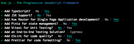 - 두번째 방법은 위 명령어를 치면 바로 처음부터 typescript, vue-router, pinia 등 다양한 옵션을 선택할 수 있게 제공된다.